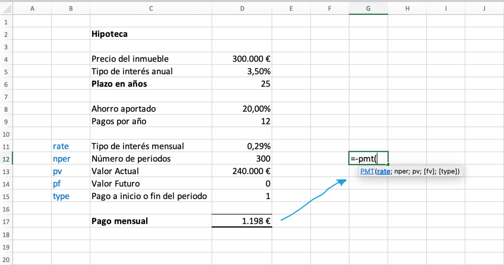 Para calcular el pago mensual utilizaremos la función de Excel PMT1 anteponiéndole el signo menos (-). Esta función requiere introducir los valores que he destacado en color azul en la imagen y que se determinan de la siguiente forma: