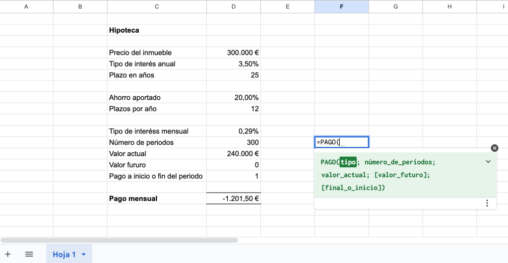 Eso es todo. Una vez que has introducido los valores de la función PMT, sin olvidarte de anteponerle un signo menos (-), obtendrás el pago mensual de la hipoteca y podrás simular con diferentes importes, tipos de interés y porcentajes de ahorro.