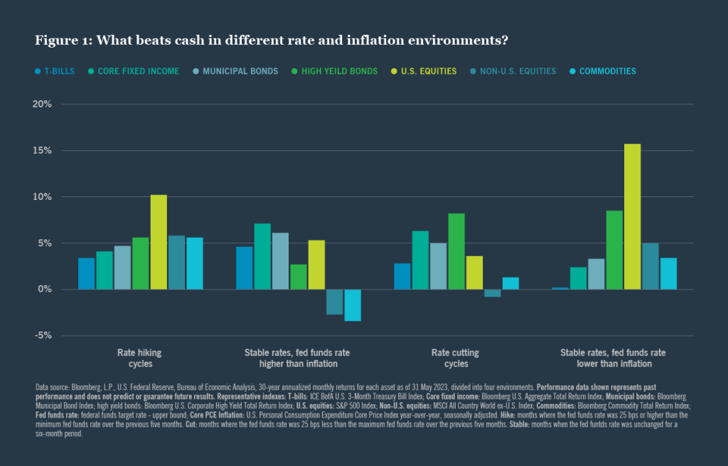 En el siguiente gráfico se muestran los retornos de diferentes activos en los últimos 30 años en distintos escenarios de tipos de interés e inflación. Se puede observar cómo ha variado su rentabilidad en cada situación económica.